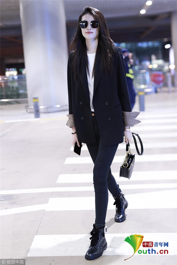 2018年10月15日,上海,何穗亮相機(jī)場(chǎng)。她身穿深色西裝搭配黑色緊身褲大秀超模身材,簡約造型依舊高級(jí)感十足,輕撩秀發(fā)散發(fā)女人味。