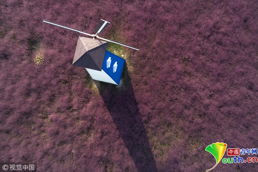 游客在生態(tài)樂(lè)園粉黛亂子草中的風(fēng)車。