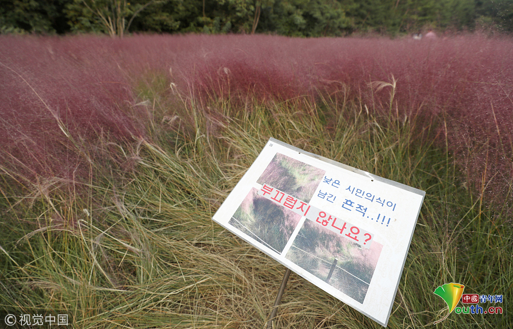 韓國(guó)蔚山,近日,蔚山公園大片粉黛亂子草盛開,但部分花海遭游客隨意踩踏。公園并沒(méi)有修復(fù)遭破壞區(qū)域,而是用繩索圍起并掛上批判性告示,呼吁游客腳下留情。圖片作者:Yonhap News Agency