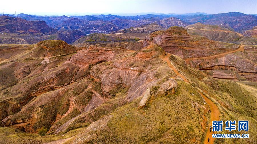 在黃土高原的陜西省延安市安塞區(qū)坪橋鎮(zhèn)王家灣,有一處峽谷丹霞地貌,是2017年陜西省地質調查院在陜北及渭北地區(qū)發(fā)現(xiàn)大規(guī)模丹霞地貌的一部分。這里的山勢頂部被黃土覆蓋,底部經流水下切侵蝕紅色砂巖外露,出露的巖石紋理如波浪,深秋中猶如一幅流動的畫卷。