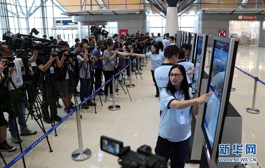 10月19日,在香港口岸旅檢大樓,工作人員在穿梭巴士自助售票機(jī)前演示購(gòu)票過程。 港珠澳大橋開通在即。 新華社記者 李鋼 攝