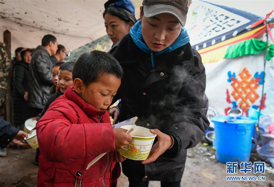 波羅鄉(xiāng)工作人員在臨時過渡安置點內為波羅鄉(xiāng)第一小學學生盛晚飯(10月14日攝)。 新華社記者 劉東君 攝
