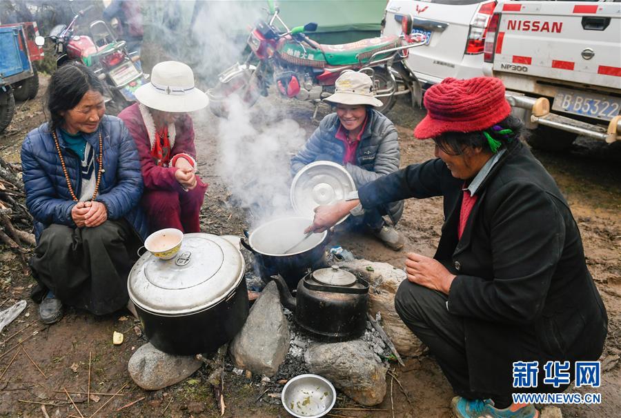 波羅鄉(xiāng)一臨時安置點內的群眾在燒水做飯(10月14日攝)。 新華社記者 劉東君 攝