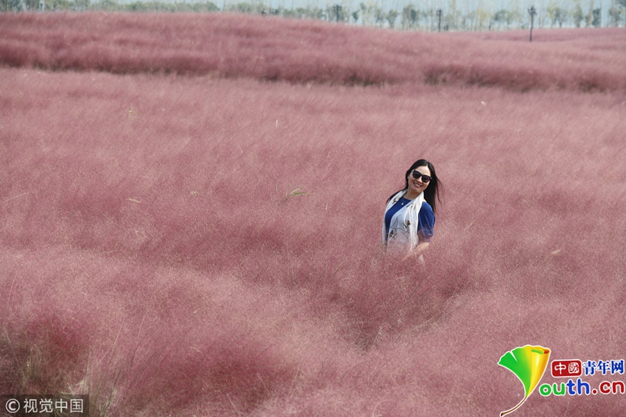 中國青年網(wǎng)北京10月7日電 2018年10月6日,游客在“粉色田野”里游玩、留影。粉黛亂子草是一種觀賞草種,該植物夏季為主要生長(zhǎng)季,全株綠色,花期為9月中旬至11月中旬,開花時(shí),綠葉為底,粉紫色花穗如發(fā)絲從基部長(zhǎng)出,遠(yuǎn)看如紅色云霧。