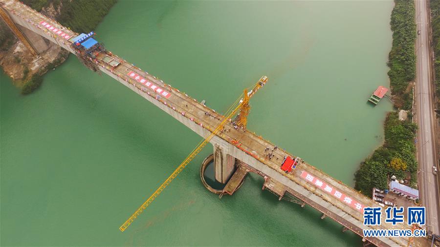 10月23日,在重慶涪陵,施工人員在渝懷鐵路涪秀二線重點(diǎn)工程——烏江右線大橋主跨合龍現(xiàn)場(chǎng)作業(yè)。 當(dāng)日,由中鐵四局承建的渝懷鐵路涪秀二線重點(diǎn)工程——烏江右線大橋主跨成功合龍,標(biāo)志著大橋主體工程全部順利結(jié)束。烏江右線大橋項(xiàng)目全程460.1米,主跨192米,跨越烏江和319國(guó)道。在兩年多的建設(shè)過(guò)程中,施工人員攻克了“不等高墩”“不對(duì)稱邊跨”“邊跨入隧”等多個(gè)技術(shù)難題。 新華社記者王全超攝