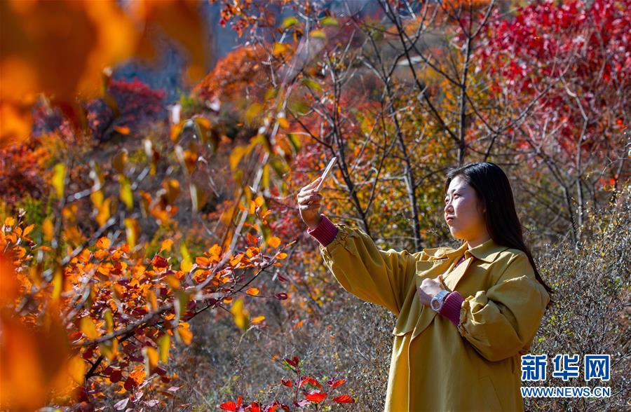 10月24日,游客在河北省武安市賀進(jìn)鎮(zhèn)后臨河村拍照留念。 金秋時(shí)節(jié),位于太行山區(qū)的河北省武安市賀進(jìn)鎮(zhèn)后臨河村的紅葉進(jìn)入觀賞佳期。 新華社記者 王曉 攝
