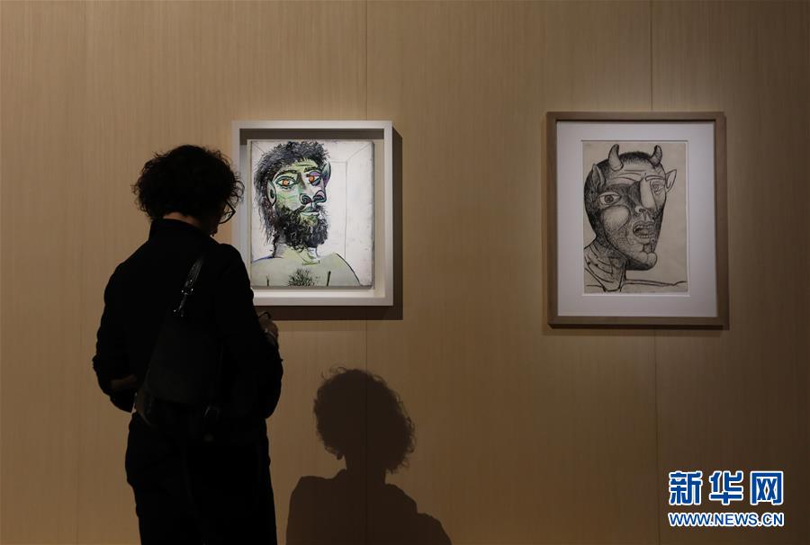 10月24日,在意大利米蘭,一名女子在“畢加索·變形記”展上觀看畢加索作品《有胡須的男人頭像》。 新華社記者程婷婷攝