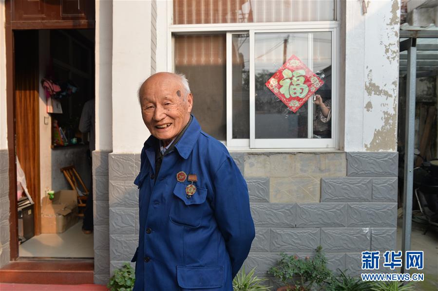 現(xiàn)已83歲的村民姚榮生佩戴紀念章站在自家院中(10月23日攝)。姚榮生生于1935年,曾參加抗美援朝戰(zhàn)爭,現(xiàn)在開弦弓村與兒孫們生活在一起。 新華社記者 尹棟遜攝