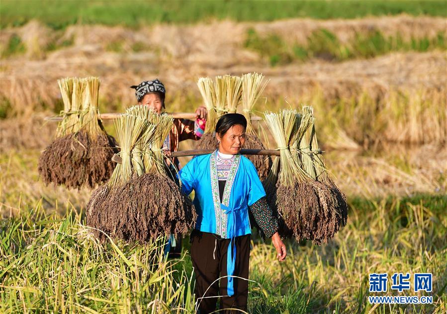 10月30日,在廣西融水苗族自治縣安太鄉(xiāng)元寶村,村民在收獲香糯。 新華社記者 吳建路 攝