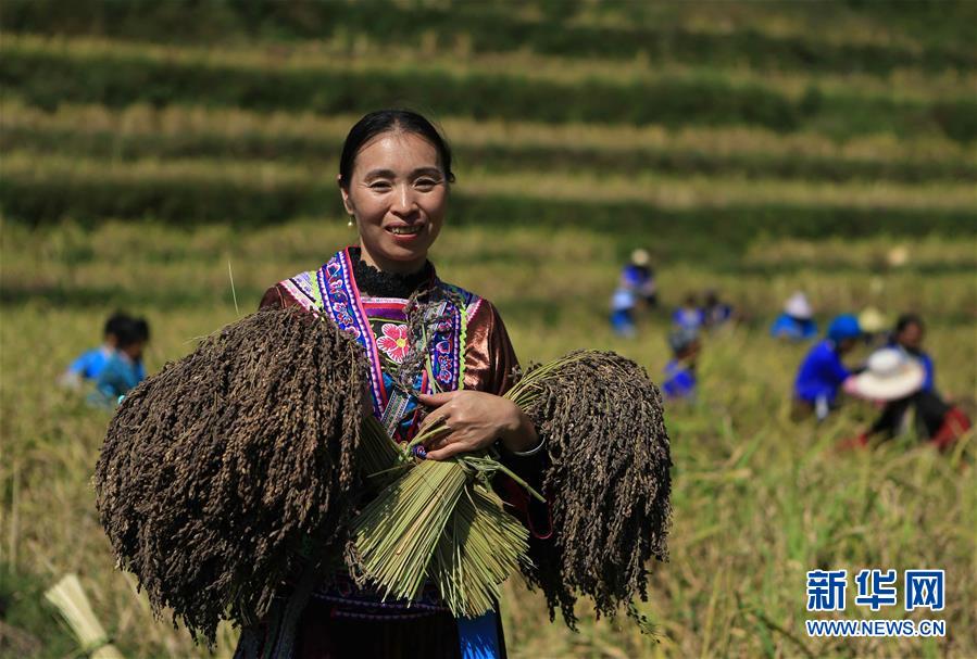10月30日,在廣西融水苗族自治縣安太鄉(xiāng)元寶村,合作社負責人謝秀萍在展示剛剛收獲的香糯。 新華社記者 吳建路 攝