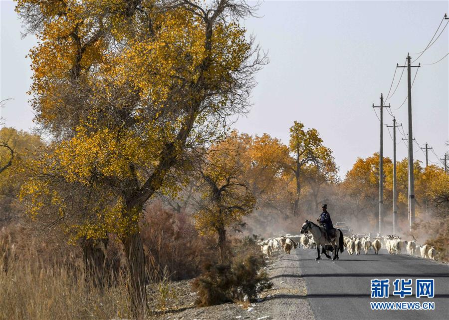 在新疆尉犁縣喀爾曲尕鄉(xiāng),牧羊人馬木提·買買提在胡楊邊上的道路上牧羊(10月25日攝)。 10月中下旬,靜靜的塔里木河中下游一片金黃。胡楊深處,條條小路蜿蜒綿長通向遠(yuǎn)方,引人入勝。 塔里木河是中國最長的內(nèi)陸河,這一區(qū)域原始胡楊林分布較為集中。隨著塔里木河連續(xù)19次向下游生態(tài)輸水,為胡楊林“解渴”,塔河兩岸生態(tài)得到明顯改善,沙地面積逐年減少。 新華社記者趙戈攝
