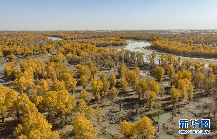 這是從空中俯瞰新疆巴音郭楞蒙古自治州尉犁縣的金色胡楊(10月25日無人機拍攝)。 新華社記者 趙戈 攝