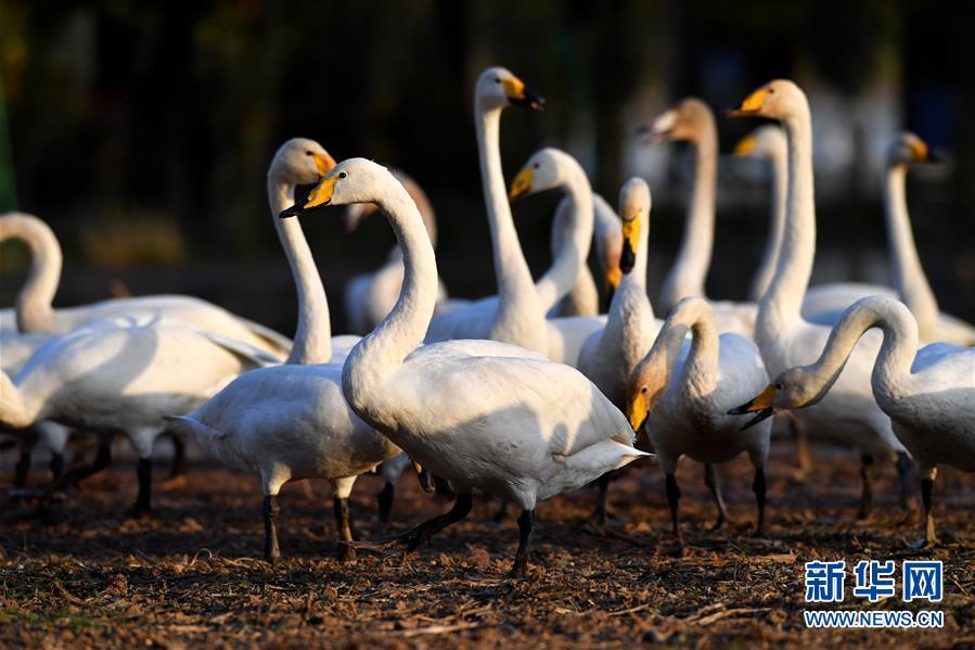 10月30日,大天鵝在山西平陸黃河濕地覓食。新華社記者 楊晨光 攝