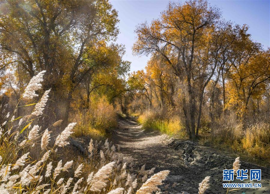新疆輪臺縣胡楊林深處的一條小路(10月25日攝)。 10月中下旬,靜靜的塔里木河中下游一片金黃。胡楊深處,條條小路蜿蜒綿長通向遠方,引人入勝。 塔里木河是中國最長的內陸河,這一區(qū)域原始胡楊林分布較為集中。隨著塔里木河連續(xù)19次向下游生態(tài)輸水,為胡楊林“解渴”,塔河兩岸生態(tài)得到明顯改善,沙地面積逐年減少。 新華社記者趙戈攝