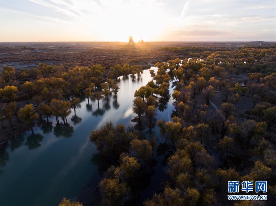 這是在內(nèi)蒙古自治區(qū)額濟納旗拍攝的胡楊林(10月10日無人機拍攝)。 金秋時節(jié),內(nèi)蒙古自治區(qū)額濟納旗胡楊林如同披上金裝,成為大漠中的一抹亮色,吸引眾多中外游客前來觀賞游玩。 新華社記者劉磊攝