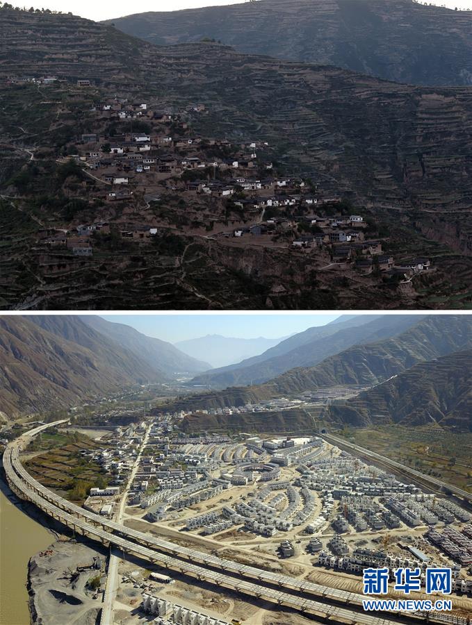 這是一張拼版照片。上圖為隴南市武都區(qū)坪埡藏族鄉(xiāng)腰道村全景(2016年9月1日攝);下圖為隴南市武都區(qū)的“新坪埡”全景(10月31日無人機拍攝)。歷經3年多的建設,在甘肅省隴南市武都區(qū)白龍江畔,一個嶄新的“新坪埡”即將建成,預計今年年底實現(xiàn)全面建成搬遷。 坪埡藏族鄉(xiāng)是甘肅省隴南市25個特困片區(qū)鄉(xiāng)鎮(zhèn)之一,2015年,當?shù)卣龀銎簣翰刈遴l(xiāng)易地扶貧搬遷重大決策,對深山上的8個村1236戶5731人實施易地扶貧搬遷,總投資4.69億元,是甘肅省“十三五”時期易地扶貧搬遷工程重點建設項目。 全面建成搬遷后,當?shù)卣畬Π徇w安置區(qū)與周邊景區(qū)進行整體規(guī)劃,打造民族風情和鄉(xiāng)村生態(tài)旅游村;同時加大群眾專業(yè)技能培訓,并引進企業(yè)實現(xiàn)群眾本地就業(yè),幫助搬遷群眾增收致富。新華社記者 范培珅攝