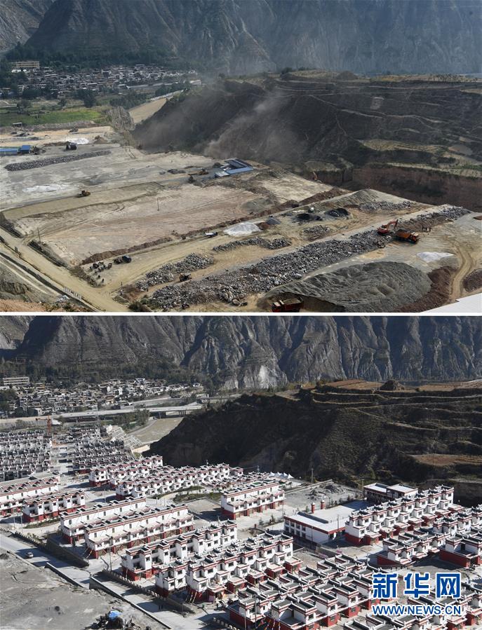 這是一張拼版照片。上圖為隴南市武都區(qū)坪埡藏族鄉(xiāng)腰道村全景(2016年9月1日攝);下圖為隴南市武都區(qū)的“新坪埡”全景(10月31日無人機(jī)拍攝)。歷經(jīng)3年多的建設(shè),在甘肅省隴南市武都區(qū)白龍江畔,一個(gè)嶄新的“新坪埡”即將建成,預(yù)計(jì)今年年底實(shí)現(xiàn)全面建成搬遷。 坪埡藏族鄉(xiāng)是甘肅省隴南市25個(gè)特困片區(qū)鄉(xiāng)鎮(zhèn)之一,2015年,當(dāng)?shù)卣龀銎簣翰刈遴l(xiāng)易地扶貧搬遷重大決策,對(duì)深山上的8個(gè)村1236戶5731人實(shí)施易地扶貧搬遷,總投資4.69億元,是甘肅省“十三五”時(shí)期易地扶貧搬遷工程重點(diǎn)建設(shè)項(xiàng)目。 全面建成搬遷后,當(dāng)?shù)卣畬?duì)搬遷安置區(qū)與周邊景區(qū)進(jìn)行整體規(guī)劃,打造民族風(fēng)情和鄉(xiāng)村生態(tài)旅游村;同時(shí)加大群眾專業(yè)技能培訓(xùn),并引進(jìn)企業(yè)實(shí)現(xiàn)群眾本地就業(yè),幫助搬遷群眾增收致富。新華社記者 范培珅攝