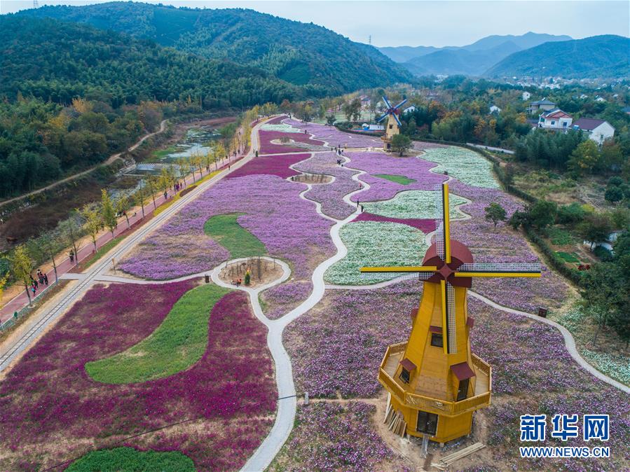11月2日,空中俯瞰小浦鎮(zhèn)的“五彩花海”,多彩的花海與金黃的銀杏林構(gòu)成了一幅美麗的秋季風(fēng)景(無人機(jī)拍攝)。  新華社記者 徐昱 攝