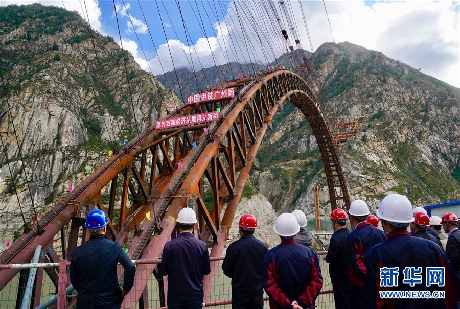 9月28日拍攝的川藏鐵路拉林段重點(diǎn)標(biāo)志性工程藏木特大橋合龍儀式現(xiàn)場(chǎng)。 當(dāng)日,隨著最后一節(jié)鋼管拱的對(duì)位和鎖定完畢,川藏鐵路拉林段藏木特大橋成功合龍,標(biāo)志著大橋主體結(jié)構(gòu)施工取得了關(guān)鍵性勝利。藏木特大橋由中國中鐵廣州局集團(tuán)承建,拱高112米,橋橫跨雅魯藏布江峽谷,水深66米。 新華社記者普布扎西攝