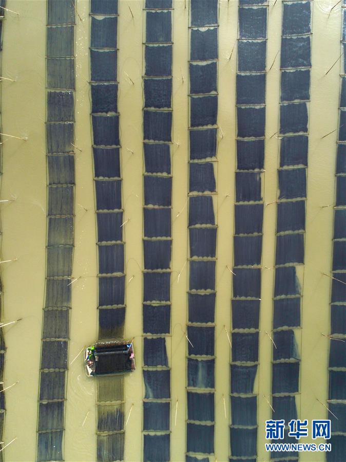 10月24日,福建莆田蔣山村村民在海上收割紫菜(無人機(jī)拍攝)?! ⌒氯A社記者姜克紅 攝