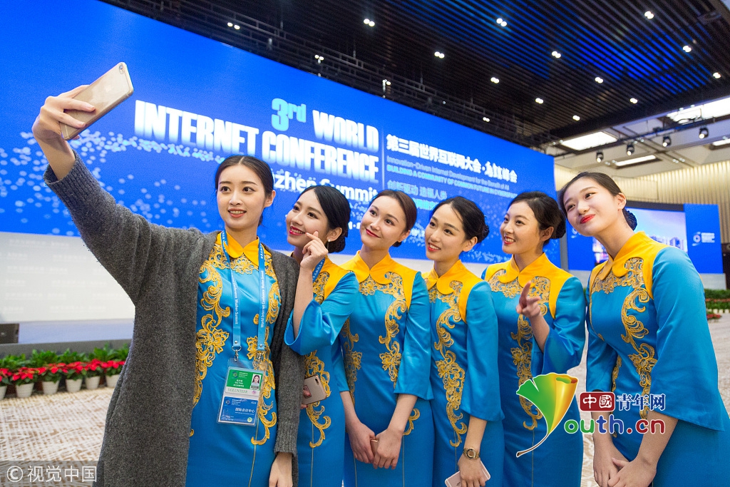 2016年11月16日,浙江烏鎮(zhèn),第三屆世界互聯(lián)網(wǎng)大會(huì)首日,身著群青鸞鳳刺繡旗袍的大學(xué)生禮儀賣萌自拍,成為會(huì)議間隙的一道風(fēng)景。