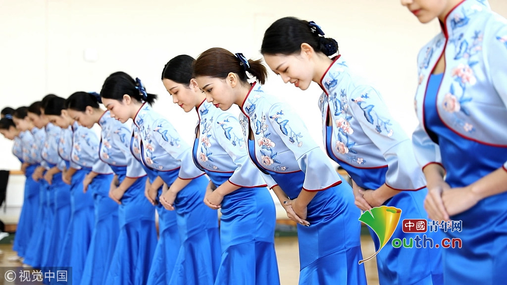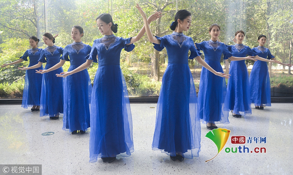 來自浙江傳媒學(xué)院的禮儀志愿者們正在進(jìn)行緊張有序的集中訓(xùn)練。圖片作者:浙江日?qǐng)?bào) 馮賀/視覺中國(guó)