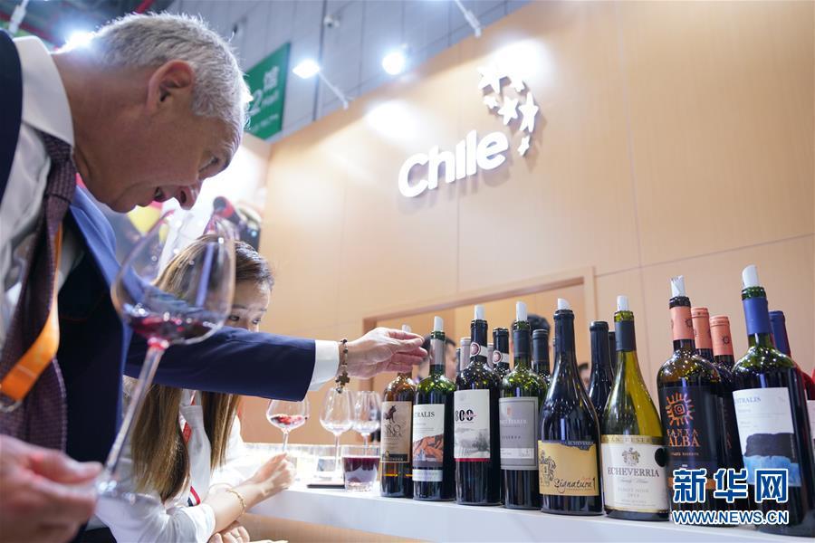 11月5日,一位男士了解智利葡萄酒。 當日,首屆中國國際進口博覽會在國家會展中心(上海)開幕。 新華社記者 孟鼎博 攝