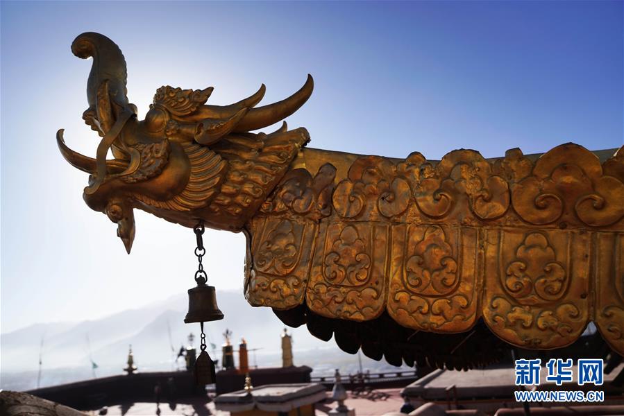 2016年,根據(jù)布達拉宮管理處申報修繕項目的申請,國家文物局先后撥款3100余萬元,于2017年正式啟動了布達拉宮頂層7座金幢、7座寶瓶以及五世、七世、八世和九世達賴靈塔殿及帕巴拉康殿五座金頂?shù)男蘅樄こ獭?新華社記者普布扎西 攝