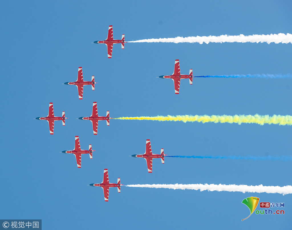 2018年11月8日,廣東珠海,第十二屆中國(guó)國(guó)際航展第三天??哲姟鞍艘弧憋w行表演隊(duì)的隊(duì)員們,發(fā)揚(yáng)連續(xù)作戰(zhàn)精神,給觀眾們表演了七機(jī)分組開花、四機(jī)編隊(duì)橫滾等高難動(dòng)作,受到觀眾們的稱贊。視覺中國(guó)