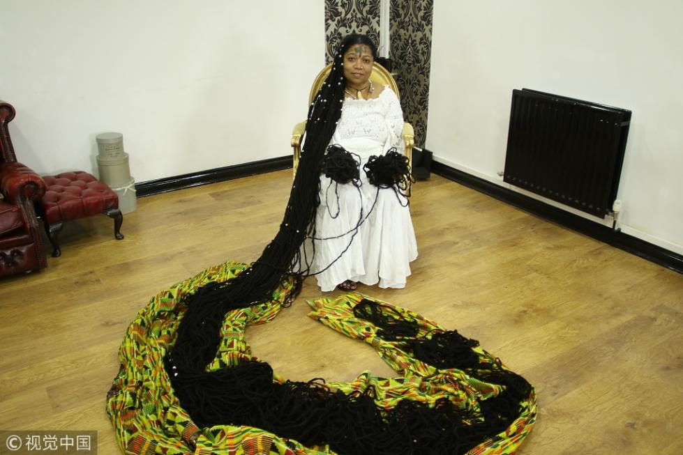 她的頭發(fā)現(xiàn)在長(zhǎng)約34米(110英尺),超過三輛雙層巴士的長(zhǎng)度。Asha Mandela十年前打破了世界吉尼斯頭發(fā)最長(zhǎng)的記錄。