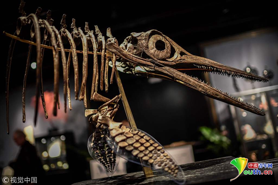 當(dāng)?shù)貢r(shí)間2018年11月19日,法國(guó)巴黎,在展出中的1.8億年前侏羅紀(jì)時(shí)期的恐龍骨架,將于11月20日在Drouot拍賣(mài)行拍賣(mài)。圖片來(lái)源:視覺(jué)中國(guó)