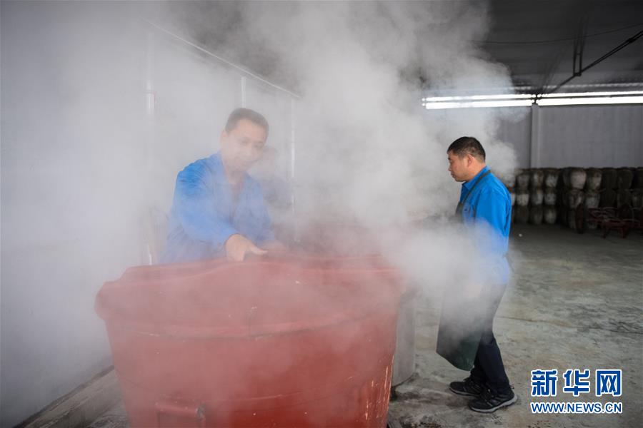 11月21日,工作人員在紹興女兒紅釀酒有限公司釀酒廠房將剛煮熟的糯米落缸。 浙江紹興一帶有“生女釀好酒、婚嫁宴賓客”的習(xí)俗,所釀之酒稱“女兒紅”。在紹興市上虞區(qū)東關(guān)街道,一家釀酒廠仍保留著傳統(tǒng)的黃酒生產(chǎn)線,恪守著近20道釀造工序,延續(xù)著傳統(tǒng)黃酒的釀制技藝和生女必釀“女兒紅”的文化習(xí)俗。 黃酒是中國(guó)最古老的酒種之一,傳統(tǒng)黃酒僅在冬季取鑒湖水和糯米釀制,所得之酒澄澈馥郁。 新華社記者翁忻旸攝