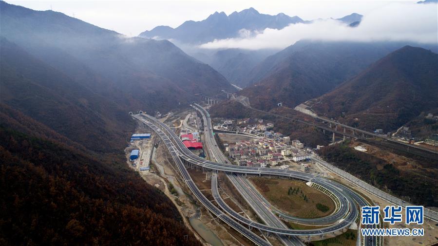 11月20日拍攝的水陽(yáng)高速公路與包茂高速公路相接的樞紐互通式立交(無(wú)人機(jī)拍攝)。 近日,記者從陜西省交通建設(shè)集團(tuán)公司了解到,陜西柞水至山陽(yáng)高速公路已全線貫通即將通車(chē)。據(jù)介紹,(柞)水(山)陽(yáng)高速公路全長(zhǎng)78.8公里,開(kāi)通后將實(shí)現(xiàn)包茂高速、福銀高速在陜南商洛地區(qū)的連接,開(kāi)辟出秦嶺南麓的一條橫向高速大通道,對(duì)完善陜西高速公路路網(wǎng)結(jié)構(gòu)、促進(jìn)陜南區(qū)域經(jīng)濟(jì)發(fā)展、加快山區(qū)群眾脫貧致富具有重要意義。 新華社記者劉瀟攝