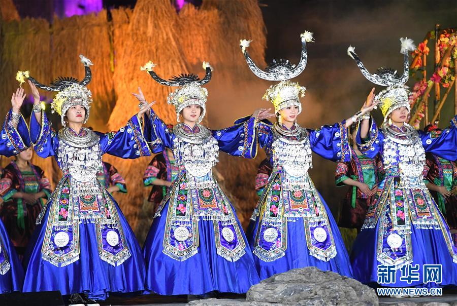 11月21日,演員表演歌舞《依依送客》。 當(dāng)日,廣西柳州市第一屆旅游產(chǎn)業(yè)發(fā)展大會暨2018第十八屆中國·融水苗族蘆笙斗馬節(jié)開幕式晚會在融水苗族自治縣舉行。 新華社記者 周華 攝