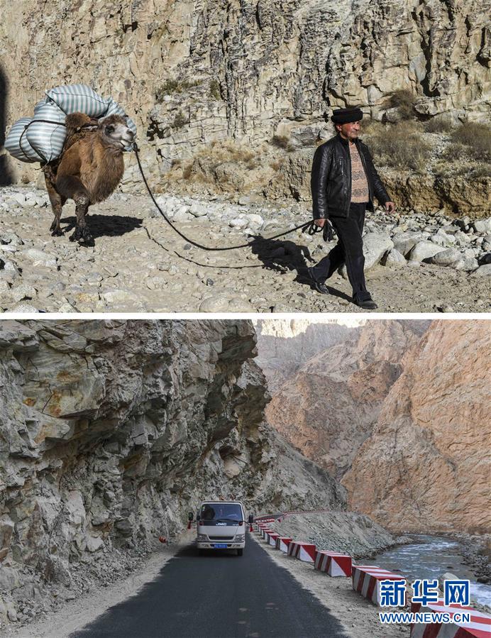拼版照片:上圖為都熱·加爾曼牽著馱有行李的駱駝走在通往阿克托尕欄桿村村委會(huì)的路上;下圖為都熱·加爾曼乘坐汽車從大同鄉(xiāng)前往塔提庫(kù)力易地扶貧搬遷安置點(diǎn)(11月17日攝)。新華社記者胡虎虎攝