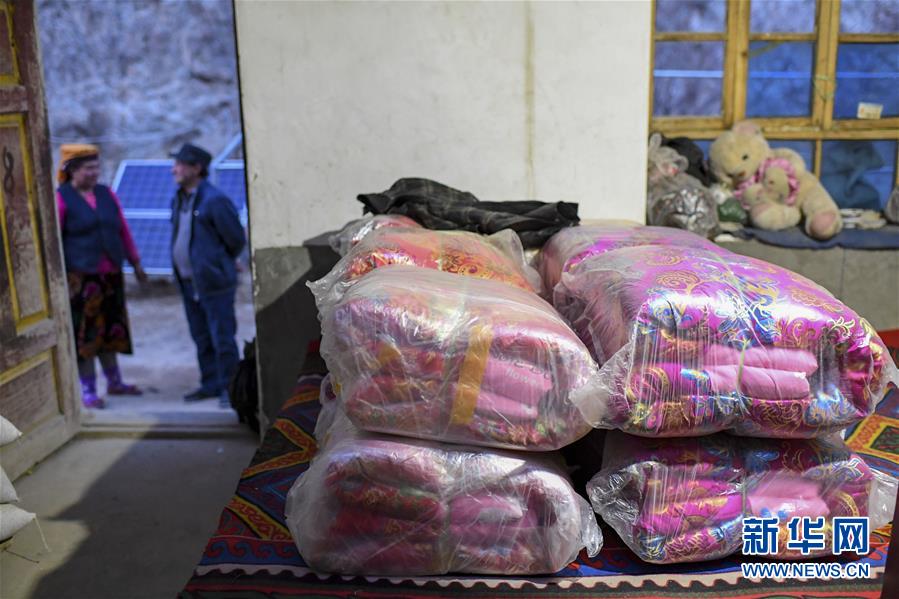 在塔什庫(kù)爾干塔吉克自治縣大同鄉(xiāng)阿克托尕欄桿村一組都熱的舊居中,新縫制好的12床被子放在屋內(nèi),都熱·加爾曼(右)和妻子在門(mén)口談?wù)摪徇w安排(11月16日攝)。新華社記者胡虎虎攝