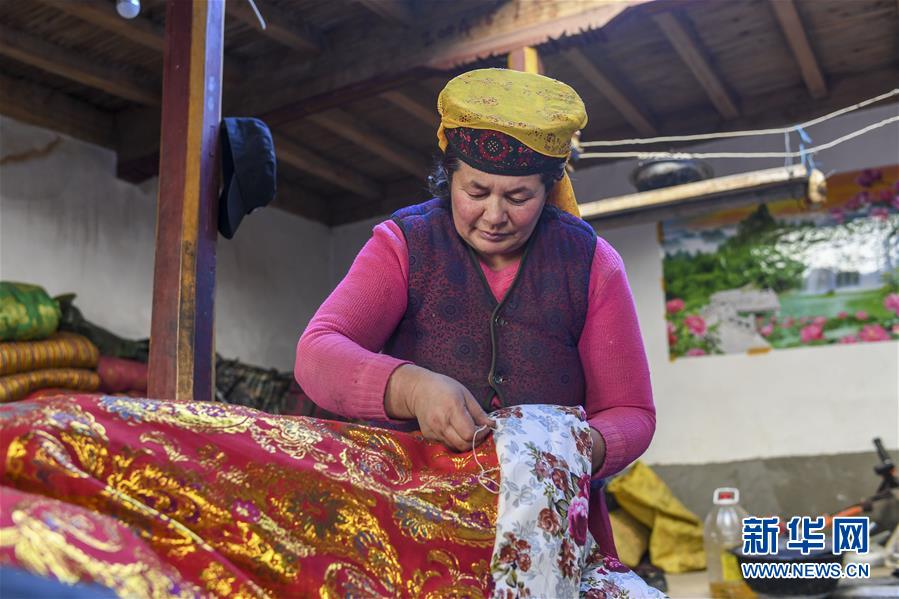 在塔什庫(kù)爾干塔吉克自治縣大同鄉(xiāng)阿克托尕欄桿村一組都熱的舊居中,都熱·加爾曼的妻子在縫制新被子,為搬遷新居做準(zhǔn)備(11月13日攝)。新華社記者胡虎虎攝