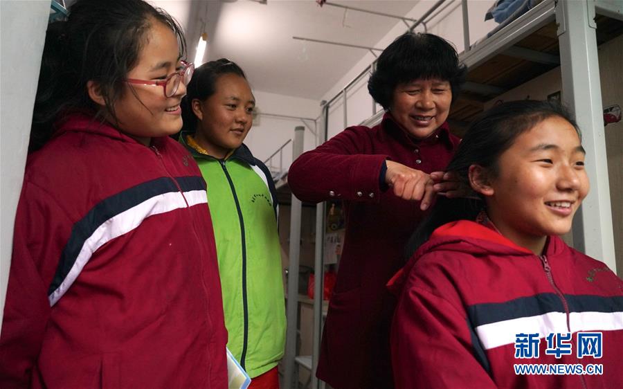 11月16日,在南昌市第十七中學(xué)宿舍,劉和平(右二)為一名西藏班學(xué)生梳頭。新華社記者 胡晨歡 攝