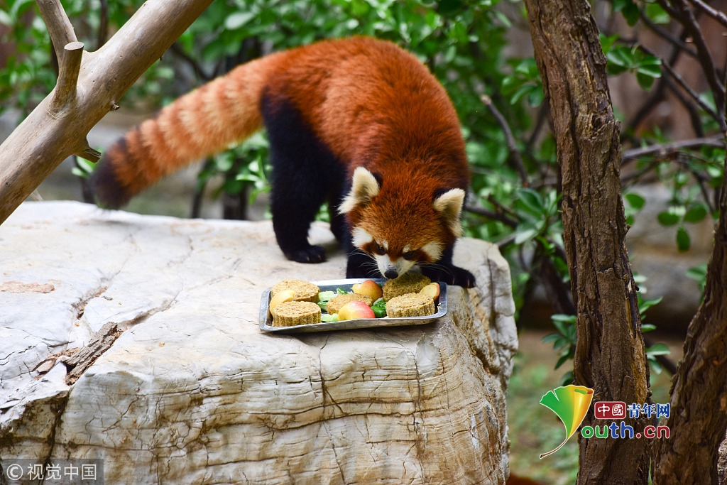 2016年09月15日,在山東煙臺動物園,一只小熊貓在吃特制的水果“月餅”。