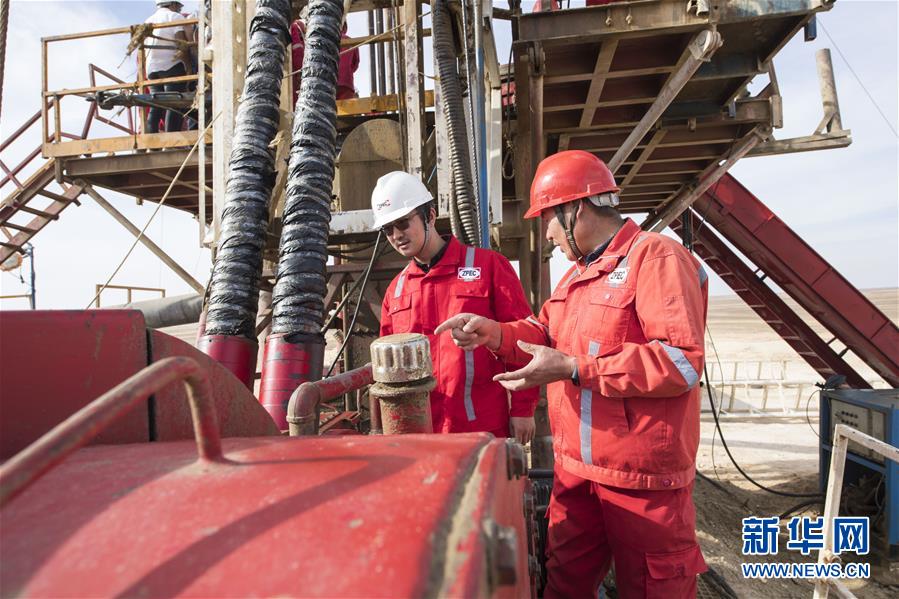 11月20日,在埃及明亞省,中曼石油埃及分公司總經(jīng)理李偉(左)在鉆井現(xiàn)場查看。 2017年,中國中曼石油公司與阿聯(lián)酋海灣集團(tuán)簽訂合同,為該集團(tuán)在埃及沙漠中的大型農(nóng)業(yè)項(xiàng)目鉆探300口水井。根據(jù)合同,中曼石油將先期完成30口井的試鉆探,剩余水井將以每月7口的速度交付。目前有超過200名工人在鉆井現(xiàn)場作業(yè),大部分是埃及本地人。 新華社記者李碧念攝