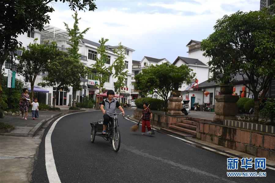 下姜村村民在村莊里騎行(2017年8月9日攝)。