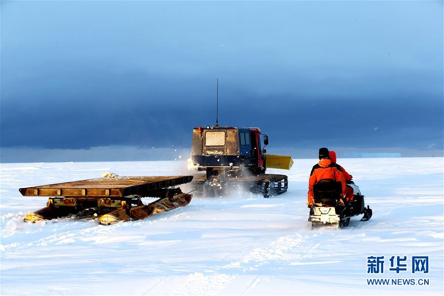 修路小組成員用雪地車裝備的鏟斗推平積雪(12月1日攝)。 搭載中國第35次南極科考隊的“雪龍”號極地考察船日前到達距離中山站44公里處的陸緣冰區(qū),準(zhǔn)備迎來本次南極科考首場攻堅戰(zhàn)——物資卸運。一支探冰小組隨即展開海冰探路,以期盡快打通從“雪龍”號到中山站的冰上運輸線,盡早啟動冰上運貨。 新華社記者 劉詩平 攝