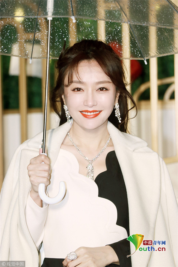 秦嵐撐傘雪膚紅唇美如畫 優(yōu)雅品香檳氣質(zhì)高貴迷人