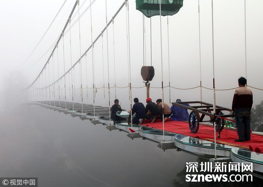 深圳新聞網(wǎng)訊 2018年12月3日,在浙江玉環(huán)市上棧頭玻璃吊橋建設(shè)工地上,工人們正在北端橋頭鋪設(shè)橋面4厘米厚的玻璃,預(yù)計(jì)46個(gè)箱梁的玻璃全部鋪設(shè)完成需到5日,然后再進(jìn)入安裝兩側(cè)護(hù)欄和拉攀抗風(fēng)拉索,吊橋工程竣工定于23日,準(zhǔn)備在2019年元旦試運(yùn)行。