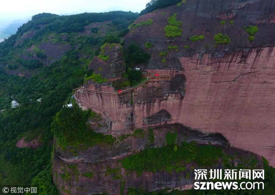 深圳新聞網(wǎng)訊 2018年6月19日,航拍江西贛州南武當(dāng)山百米高空玻璃棧道。棧道緊貼峭壁,在懸崖之上凌空蜿蜒穿行,猶如一條玉龍盤旋在綠林石海之中。 南武當(dāng)山位于江西最南端的龍南縣武當(dāng)鎮(zhèn)境內(nèi),景區(qū)核心面積達(dá)到13.5平方公里,擁有99座千姿百態(tài)的巍峨石峰,丹霞地質(zhì)風(fēng)貌突出,連綿十里,被稱為“武當(dāng)十里畫廊”。