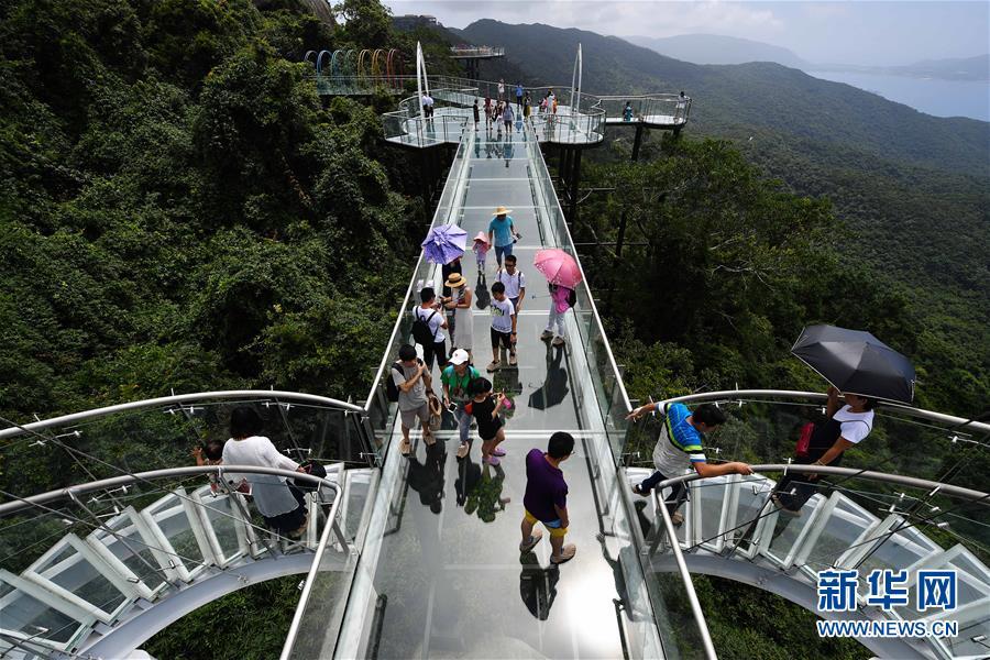 8月31日,游客在玻璃棧道上參觀游覽。近日,位于海南省三亞市亞龍灣熱帶天堂森林公園的大佛石全海景玻璃棧道開始正式營業(yè)。凌空而建的玻璃棧道全長400米,游客可將亞龍灣的美景盡收眼底。新華社記者郭程攝