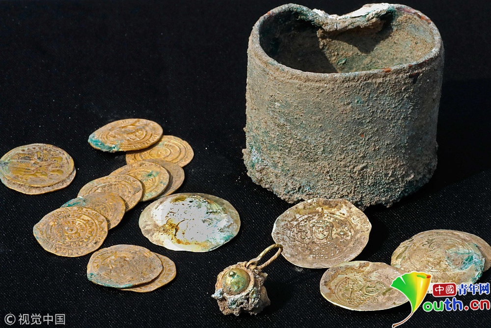 當(dāng)?shù)貢r間2018年12月3日,以色列凱撒利亞,以色列地中海小鎮(zhèn)凱撒利亞發(fā)掘出24枚古代稀有金幣。