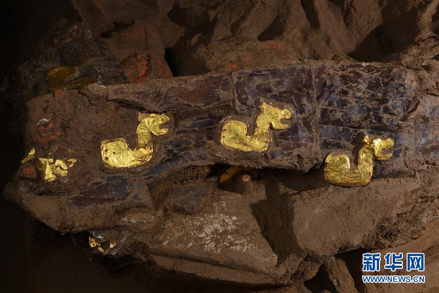 這是在位于河北行唐的考古實(shí)驗(yàn)室內(nèi)拍攝的局部車廂上鑲嵌有成組對稱的貼有金箔飾片的金屬質(zhì)獸型牌飾(12月4日攝)。新華社記者 李賀 攝