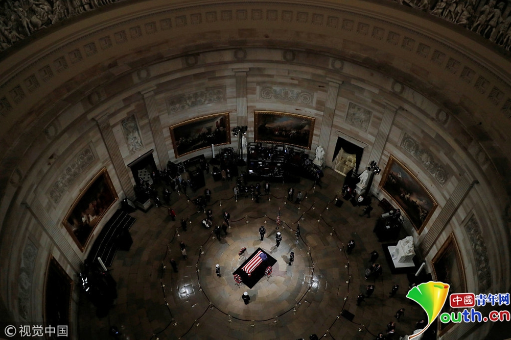美國前總統(tǒng)老布什的遺體3日下午運(yùn)抵首都華盛頓,安放在國會大廈圓頂大廳,接受吊唁。