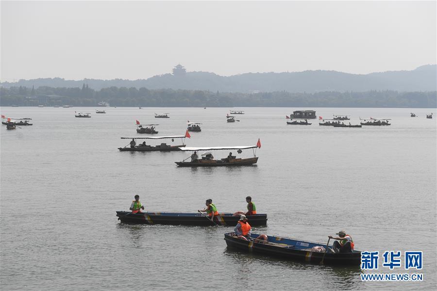 8月14日,游客乘船在西湖游玩(無人機拍攝)。 新華社記者 翁忻旸 攝